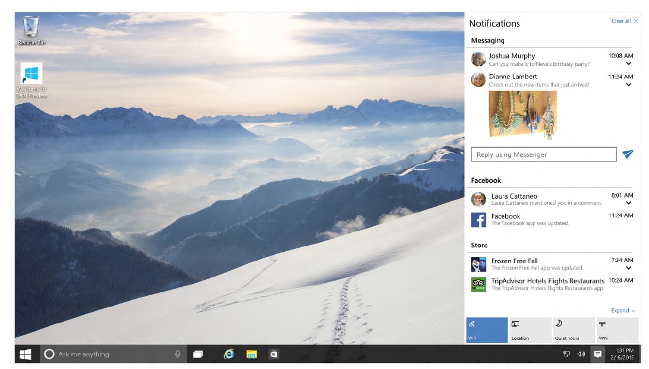 Remember the Action Center? That annoying flag that wouldn’t stop telling you things you don’t care about? Now it tells you things you need to know and comes in handy. Do you remember all those apps I was talking about? Action Center is now your notification hub, like on your phone. Think of this as your pull-down menu. Email alerts from the new email app, Windows Updates, notes, reminders—it’s all here. The new Action Center notification pop-up is also overhauled and is now a nice little square box that blends in with the OS and is not annoying at all. Think of it as a pop-up notification on your phone. Simple and elegant, yet very useful. I’m also talking about every single pop-up that used to appear in that damn corner. New devices being installed, errors, Windows update notifications, everything.