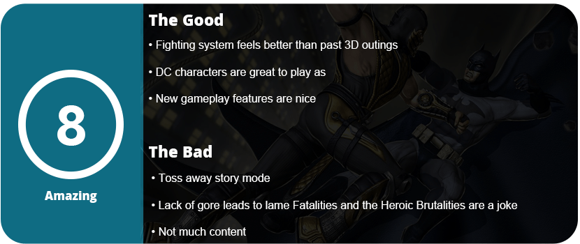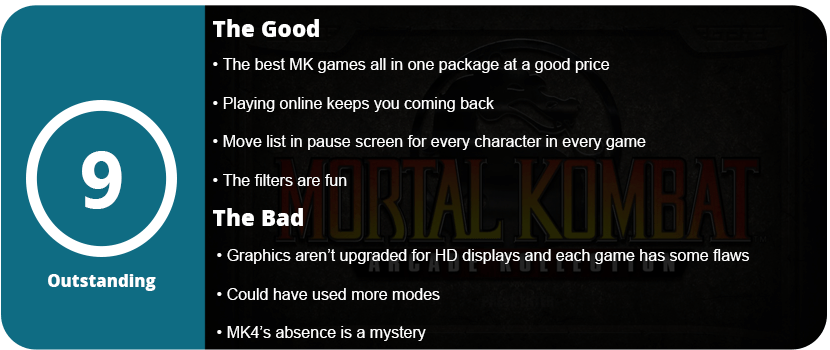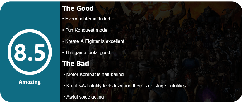 Overall, MK: Deception is a fantastic fighting game that is only hampered by slower combat and a horrible Konquest mode that must be played to unlock half the game’s roster and extra costumes. Puzzle and Chess Kombat are excellent modes that add dozens of hours of fun, and online play is always welcome.