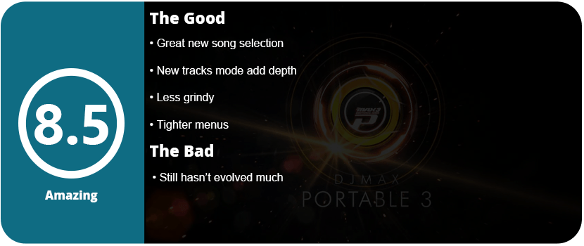 DJ Max 3 is well worth the purchase for series fans and newcomers alike. There’s enough content to unlock to keep you very busy, and replaying the excellent song roster is very enjoyable. I hope to see further changes in DJMP4 because this series has lots more potential.