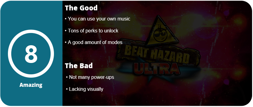 So this is once again a game that makes you the decider of how fun an experience you get. The engine underneath does a good job using the songs to be a fun space shooter, but I would like to have seen more power-ups or maybe something more 3D. If you don’t like 2D space shooters, you won’t like this, even if you get to use your own music. The game can get really hard quickly and can be a bit confusing at first until you get the hang of it. There are quite a few modes, such as multiplayer, boss rush, and endless mode, so there is some variety there. For the low price, you can’t really go wrong, so pick it up and enjoy the craziness!