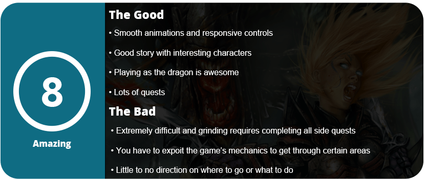 Combat tends to be too difficult in the sense that you have to use exploits due to the fact that you can easily be overwhelmed. Towards the end of the game, I encountered about 12 level 30 enemies, and I was only level 31. I had to go attack them a little bit until I was almost dead (I had no potions to heal me or restore mana), so I ran outside the cave and changed into dragon form (yes, you can be a dragon in this game!) and let my mana quickly generate. I then healed myself as a dragon (you share health and mana in each form) and then ran back into the cave. This is the kind of irritating exploitation of game mechanics that makes the game a chore and not very fun.