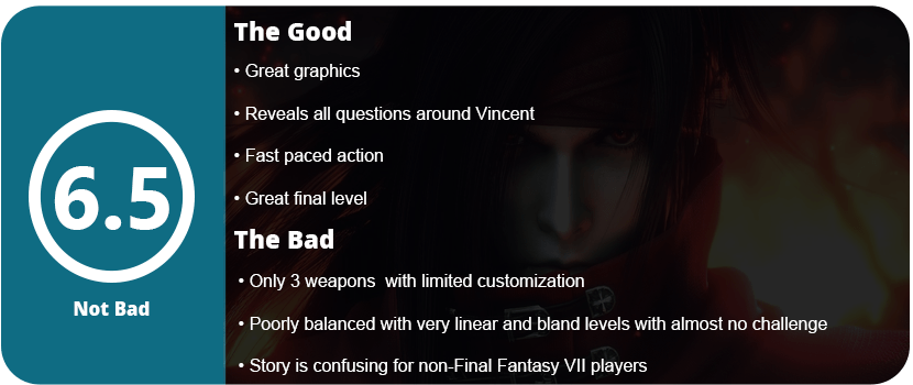 This is one of those games that Final Fantasy fans don’t want to admit they played. It got a lot of hype when it came out because it was a shooter set in the FF universe, which is very odd and abstract from the typical JRPG formula. Many people didn’t have high hopes for it since Japanese gamers don’t really play shooters, but I passed it up due to the flak and poor reviews it got. It came out at the tail end of the PS2 life cycle and was overlooked by the hype of the next generation and many other games coming out. This was one of the projects for the Final Fantasy VII extension. This game tells the story of Vincent Valentine and how he came to be and delves deeper into his relationship with Lucrecia, the FF7 team, Hojo, and a few other characters. Honestly, the story is very confusing unless you have played FF7 already; in fact, all the FF7 projects make no sense unless you have played the PS1 classic. I never played it as a kid, so the story made no sense. Even if I had, it’s pretty dry, dull, and uninteresting until the very end. Vincent doesn’t really say too much, and the story is poorly edited and feels chopped up and mixed around.