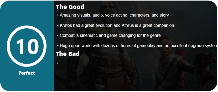 Overall, God of War is the single best game to be released this entire console generation cycle. This is what we needed more of from every console maker. It took Sony too long as it was, but here we have it. The game is literally perfect, and I can’t think of any flaws in God of War that are detrimental to the overall game. I could say the game is too hard in spots, but that’s because I ventured too far too early and needed to come back later. I could say there are a lot of hidden items and they are hard to find, but I need to explore more and look more carefully. I could say that the story is too short and the lower amount of epic bosses is what made God of Warand hurts the game, but it just doesn’t. God of War is the best game I have played in the past 10 years, and many other developers need to take note.