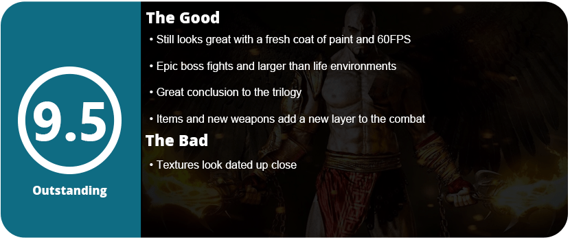 Overall, God of War III is still an amazing game to this day. It was one of the best PS3 games to be released and is a must-have for PS4 owners. Sadly, the previous games were not included, so if you jump into this game, you won’t understand a single thread of the story.