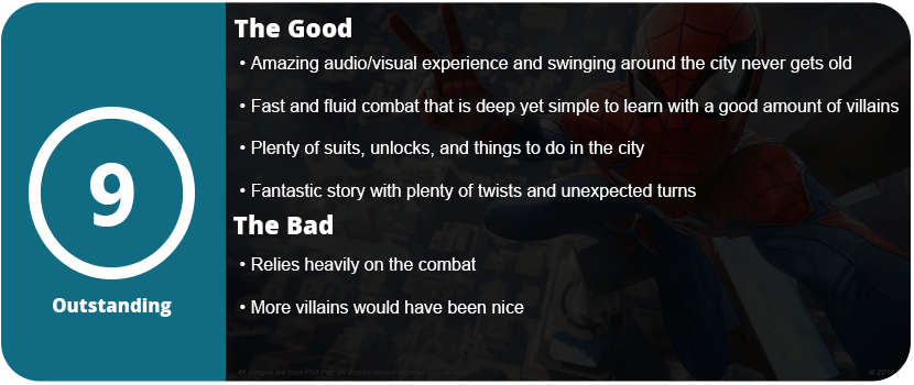 Overall, Marvel’s Spider-Man is one of the best comic book games ever made, period. It nails every single thing you would want in a Spider-Man game. I felt just like the hero, and the story kept me hooked with plenty of things to do in the city that didn’t feel boring or tiresome. I would say the game relied a little too much on combat at times, and it felt a little abused, but there’s not much wrong with this game. Maybe a few more villains, but there are more wishes than issues with the game.