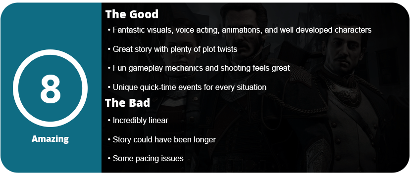 You play Grayson Galahad, a Knight of the Order charged with treason and crime untold. The story starts at the end and picks up at the beginning to wrap back around to the end. There are a lot of plot twists, amazing characters, excellent acting, and fantastic voice work to enjoy during this 6-hour campaign. Once I got ahold of Grayson, I started slowly walking around linear hallways, picking up photos and enjoying the scenery. A few seconds later I was presented with quick-time events, another walking session, and more quick-time events. After this, it was another long cutscene before I got control of Grayson again. During the first 30 minutes, I figured this was a build-up for something tense or to slowly eek out gameplay for the player, but it continues throughout the entire game, and that’s not necessarily a bad thing.