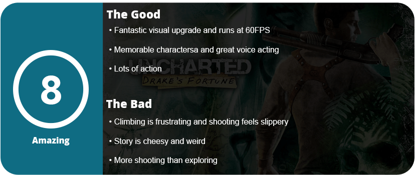 For fans of Uncharted, I will just say this: this is the definitive version of the game. It runs at 60FPS, which makes the gameplay so much smoother, and the textures and visuals are just smoothed over and given a polish to make them look clean. It doesn’t look nearly as good as the PS4 games or even Uncharted 2 or 3, but it’s impressive how well the game holds up today.
