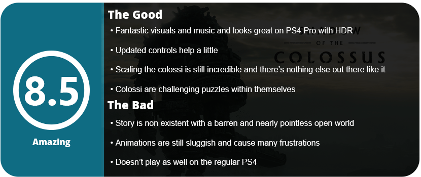 Overall, Shadow of the Colossus is well worth a purchase for newcomers and anyone who played the previous two versions. The visual upgrade alone and higher framerate are well worth it, and I feel this is the version that the developers originally envisioned but just couldn’t pull off with the technology at the time. Shadow of the Colossus is a piece of gaming history. Pushing gaming conventions to their limits as well as an underpowered piece of hardware and a vision that was bigger than life, Shadow of the Colossus is a must-play for any PlayStation fan.