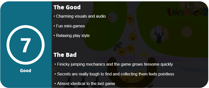 LocoRoco 2 is full of charm, but older players may grow tired of it quickly. It’s a one-trick pony and is nearly identical to the first game in almost every way. Collecting items feels pointless, and they are very difficult to find in levels. The boss fights are annoying and hard due to the finicky jumping mechanics, but it is an overall enjoyable game.