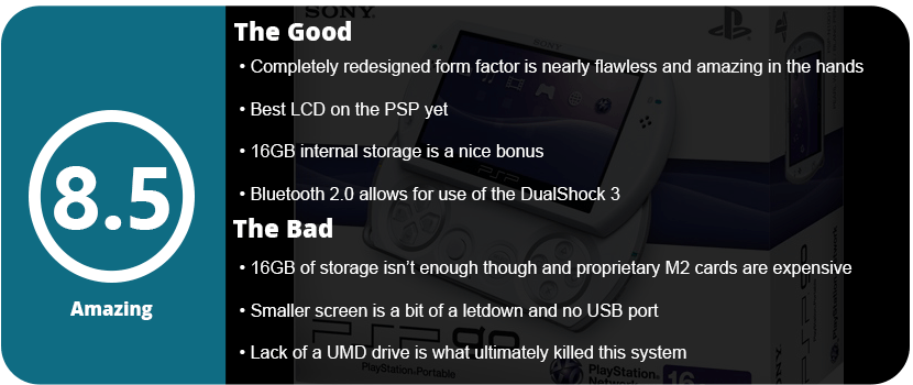Most people complain that the Go has a screen that’s almost half an inch smaller than the previous models. After a while, you don’t notice, and the picture is extremely clear due to the better LCD technology inside the Go. The “looking through a screen door” issue is gone here, and the screen is crisp and bright even by today’s standards. Overall, I can consider this the Gameboy Advance Micro of the PSP. Every handheld system usually has a miniature “best of” variation, and this is it.
