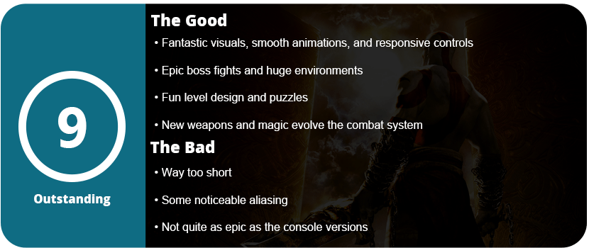 Overall, Ghost of Sparta is much better, with memorable moments involving more enemies, longer gameplay (about 6 hours), and more bosses. The fight system is tweaked to feel different from Olympus. The game even looks better because Sony finally unlocked the full 333 MHz of the PSP processor, so Ready at Dawn was able to push the system to its full limits. Ghost of Sparta is a memorable God of War game and will probably become a fan favorite.
