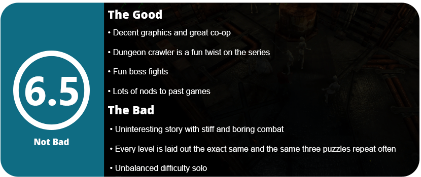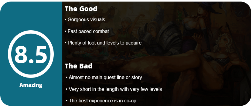 I just wish there was so much more to this game. It feels so small and claustrophobic. The short levels, the nearly non-existent questline, and the story—but at least the characters you pick are fun to use, and the controls work well. The art itself is stunning, with beautiful water-color backdrops and crazy-looking enemies and bosses. This game is mainly designed for fans of the co-op arcade RPGs of yesteryear from Capcom. Not much of a story, but tons of combat, enemies to kill, and levels to acquire. If you want a story-heavy RPG like The Elder Scrolls or Fable, you won’t find that here.