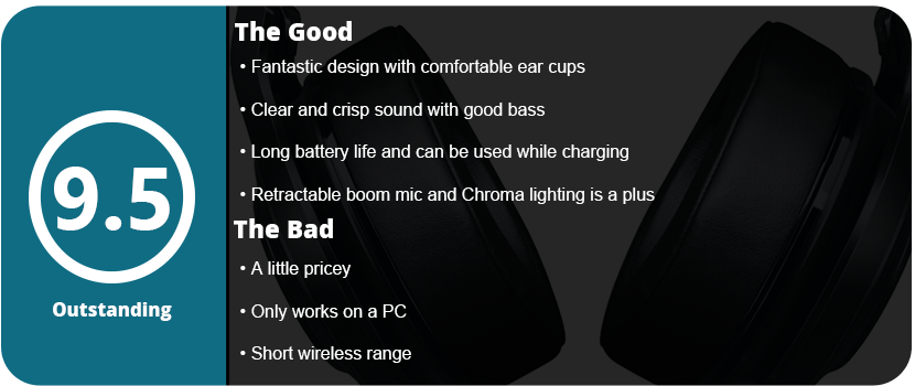 After using this set for 3 days, I have to say that I am completely satisfied. They don’t hurt my ears or head, they sound amazing, the software works, and the chroma lighting is just a small touch to add to that great pile. It’s a shame these aren’t for consoles, as console owners are really missing out. I should be happy with these until they break or die on me, and from the looks of it, that could be quite some time.