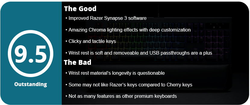 Overall, the Blackwidow Chroma V2 is a fantastic keyboard and the best one I have owned. It may not have as many gimmicks or features as other keyboards, but its quality and overall usefulness are at the top. From the amazing Chroma lighting to the magnetic wrist rest and great-feeling keys, as well as the USB and 3.5mm passthrough, the Chroma V2 has a few tricks, and I doubt anyone would be disappointed.