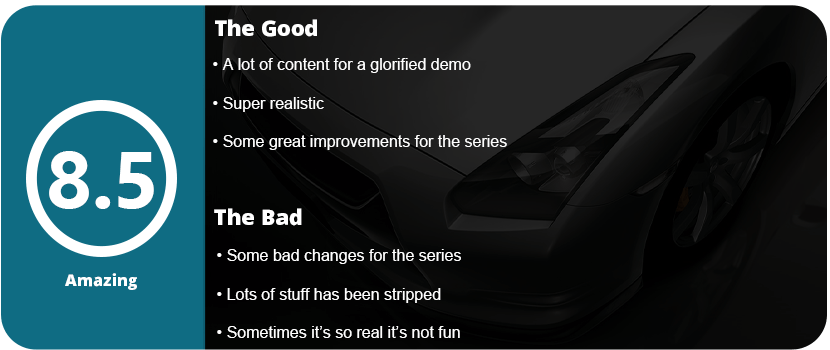 Forza 5 looks fantastic; in fact, it’s still one of the best-looking games to date despite being on a console, but there’s just not enough content to justify spending 50+ hours to perfect every event. There are plenty of cars, but none of that matters if there’re not enough tracks to play on. There aren’t even DLC tracks, which is a real shame. My only gripe is that after you turn off so many assists to make the game more challenging, you hit a wall. Either it’s too easy or way too hard. I turned off just enough assists to get some extra credit bonuses, but then I started upping the difficulty and turning more stuff off, and it became a chore after that. Every car spun out of control and was terrible to drive unless I went and fine-tuned each car for no assistance. This starts teetering into unfun territory for someone who just wants a realistic racing game without the chores tacked on.