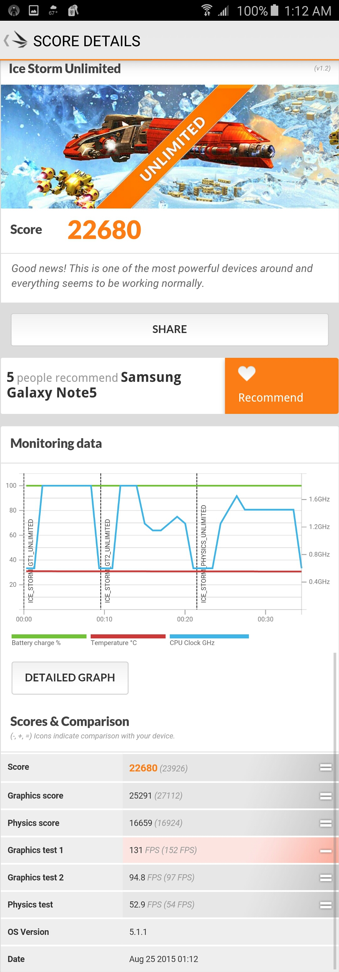 IceStorm Unlimited shows the Note 5 is extremely powerful when it comes to Open ES 2.0 rendering at 720p. IceStorm is a benchmark that can give a more even and balanced test over nearly every device that has been released in the past 3 years. The Note 5 actually outperforms some tablets and laptops, which is extremely impressive. The IceStorm Unlimited test consists of three: Test 1 stresses the GPU with vertices, while Test 2 uses a lot of pixels on the screen. Test 3 is a physics test to stress the CPU. The iPhone 6 Plus is about 100 down the list, with a score of around 17,000.