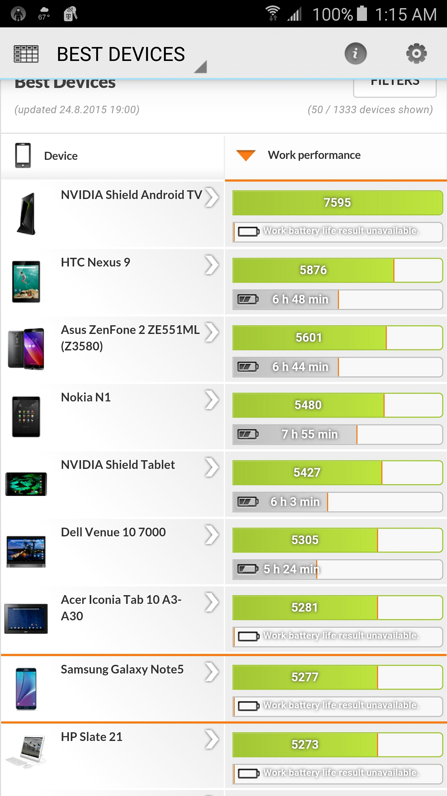 PCMark is actually a benchmark for everyday use of the phone, including video streaming, read/write access speed, web browsing, photo editing, and typing. This benchmark shows that the Galaxy Note 5 outperforms tablets and laptops, which is once again very impressive. The buttery smooth operation of the Note 5 just can’t be stressed enough. This is the fastest and smoothest phone I have ever used, and that’s not just because the phone is new. The PCMark app is not available for the iPhone, so a comparison can’t be done.