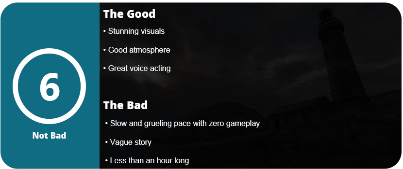 The game is stunning to look at, but you won’t see the true beauty of the engine until you get into the caves, where you get to witness gorgeous water and lighting effects. This is short-lived because this area is only about 10–15 minutes long, as are the other four areas. This leads us right into the game’s worst problem: It is less than an hour long. Even when you get to the end, you still don’t know why you played this game or what its purpose is. The story is very vague, and you never quite know what’s going on. This is hardly a game and is more of a technical showcase. If you can stomach this sort of thing, then go ahead, but you aren’t missing anything if you skip out.