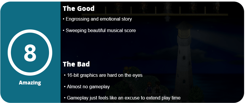 Overall, To the Moon has a story that will tug at your heartstrings, as well as the music, but the gameplay feels like an excuse to extend the 1-hour story to barely four hours. If the gameplay was a little more engaging, I wouldn’t complain about it so much, but as it is, stay for the story and you will be entertained.